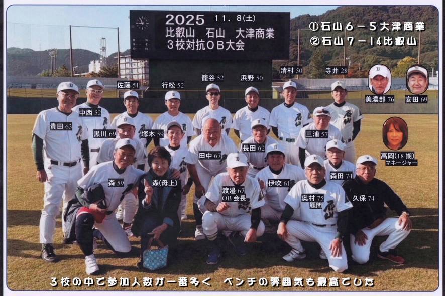 11/8(土) 晴天の下、皇子山球場にて石山、比叡山、大津商業3校対抗OB野球大会が開催されたとのご連絡がありましたので、掲載させていただきます。
